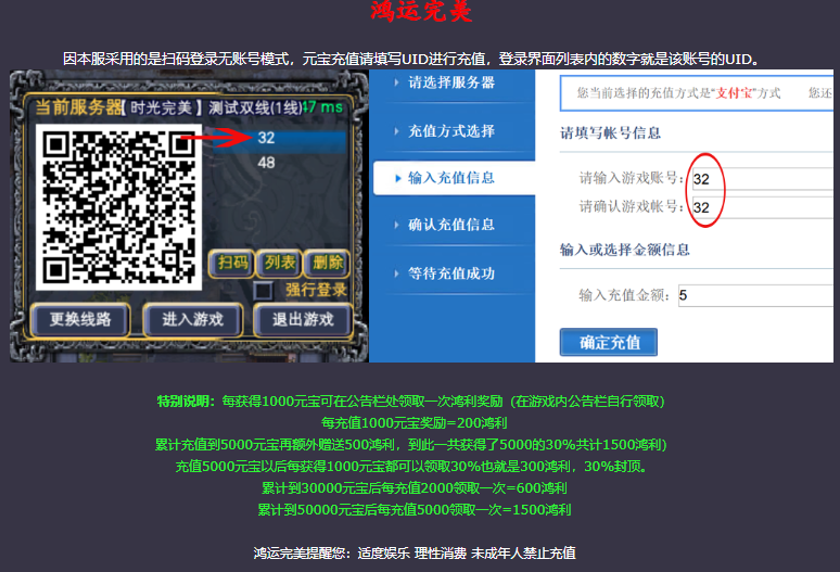 充值:只出售元宝,元宝比例1:1,充值赠送100%,概不还价,所有物品皆可在游戏内获取,无任何变态装备和物品道具。元宝累计到一定数量,充值返利30%鸿利元宝,可自助在公告栏处领取一定的鸿利元宝奖励!